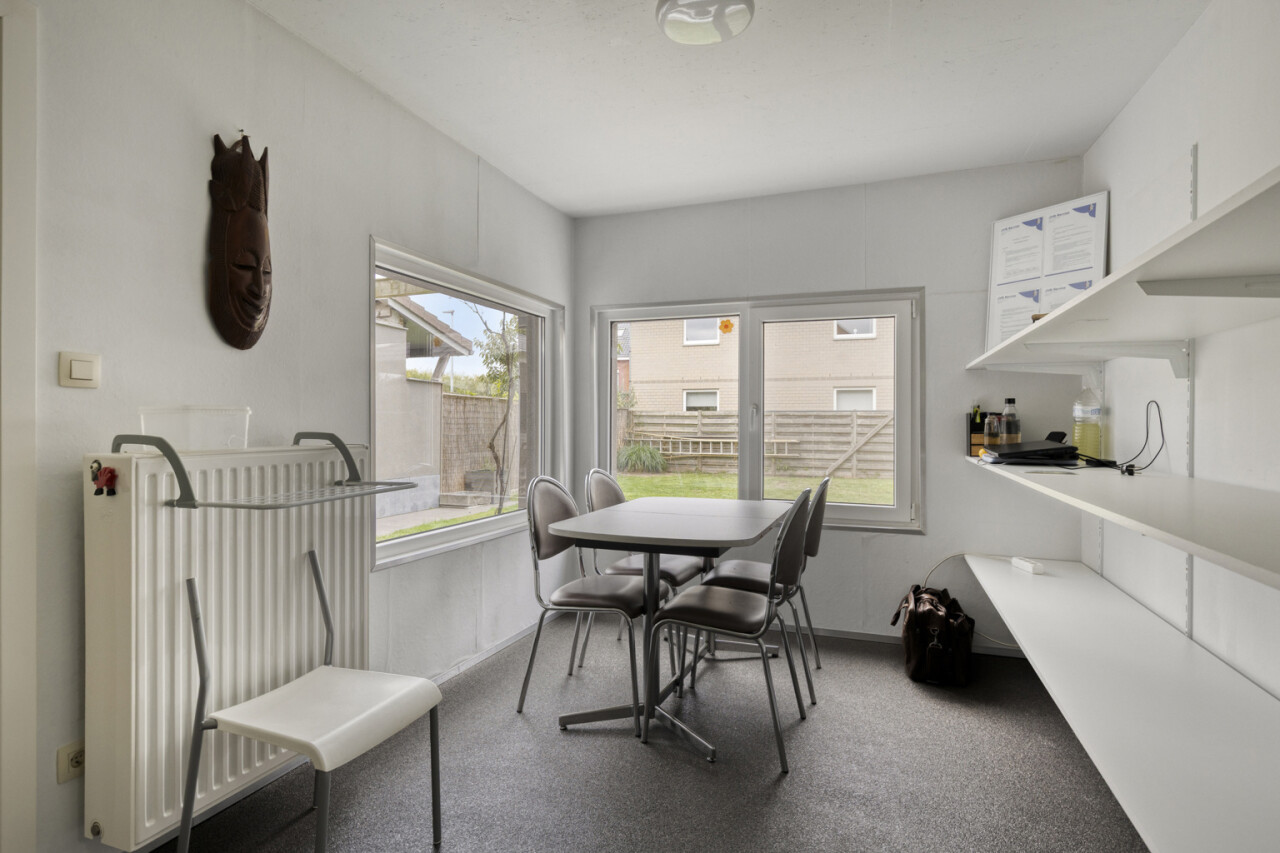 Bij binnenkomst word je verwelkomd in de ruime inkomhal met gastentoilet. Rechts bevindt zich een eerste royale ruimte die perfect kan dienen als leefruimte of salon. Verder door vinden we de keuken met eethoek, waar je dankzij het uitzicht op de gezellige tuin volop kan genieten van licht en groen. Daarnaast is er nog een ruime garage met plaats voor wagen, fietsen of extra bergruimte.