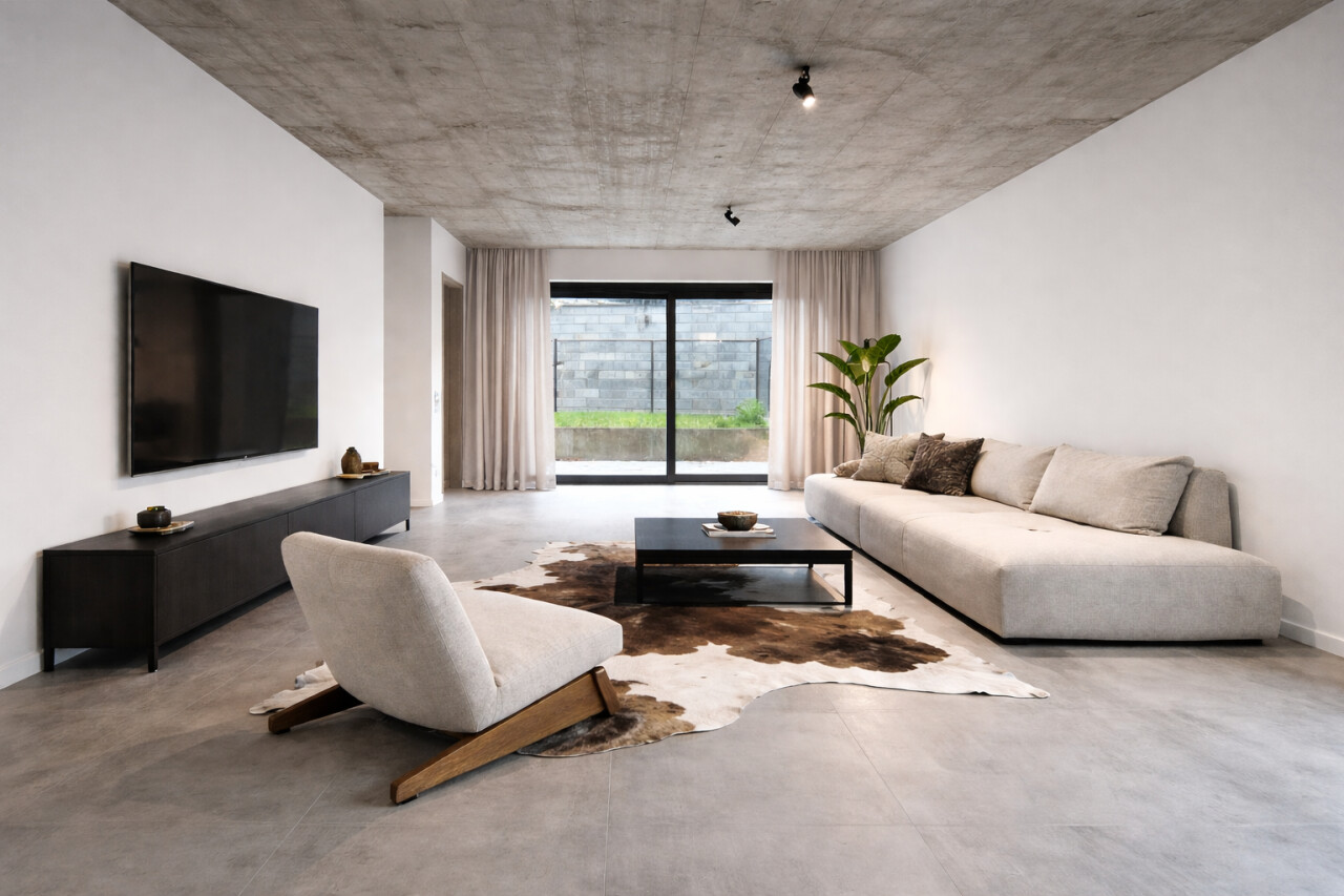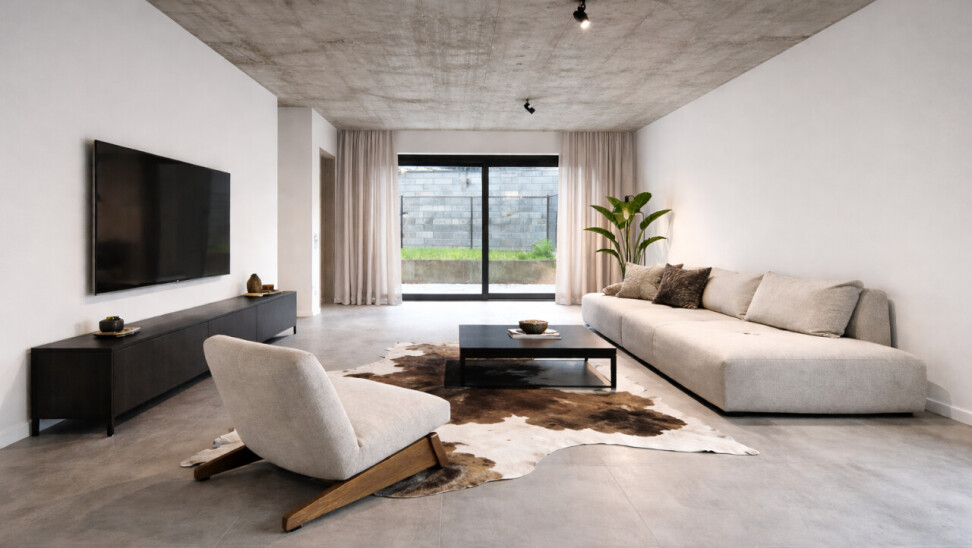U komt binnen via de inkomhal, die rechts toegang geeft tot de lichtrijke leefruimte met open keuken.