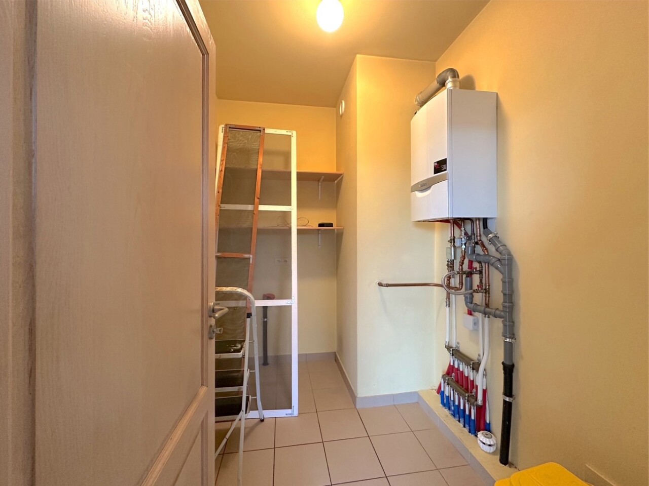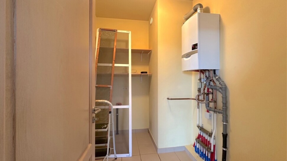 Berging: 4,5m² op tegelvloer - voorzien van aansluiting wasmachine - voorzien van de verwarmingsketel (Vaillant)
