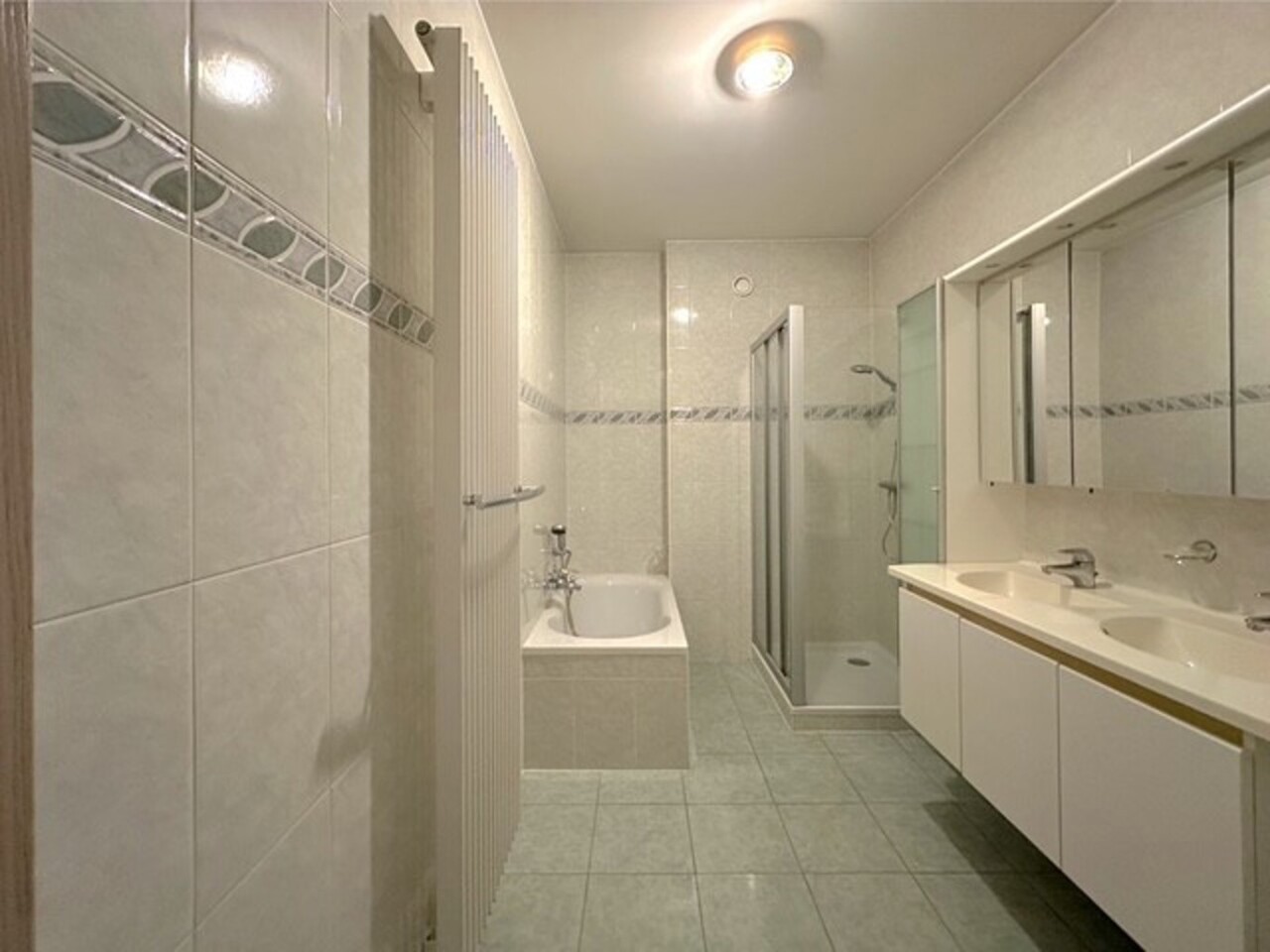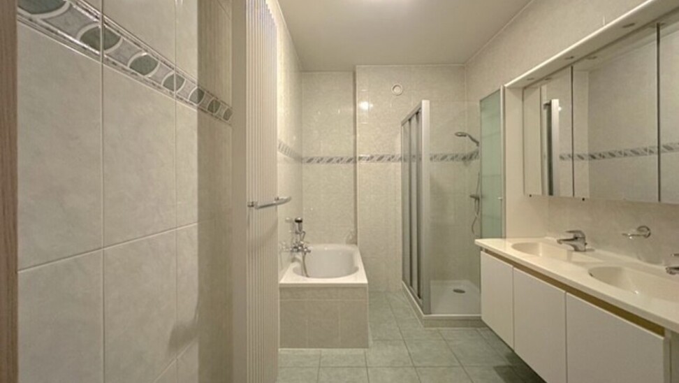 Badkamer: 6,3m² op tegelvloer, wanden volledig betegeld en voorzien van een badkamermeubel met dubbele wastafel, 2 kolomkasten en spiegelkast, ligbad, douchecabine, handdoekradiator