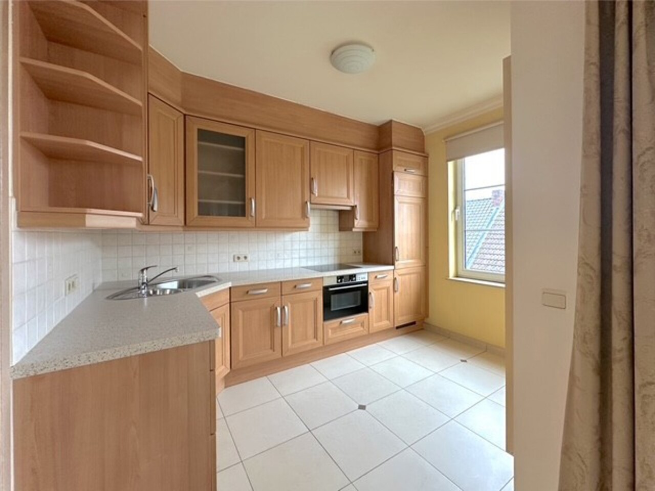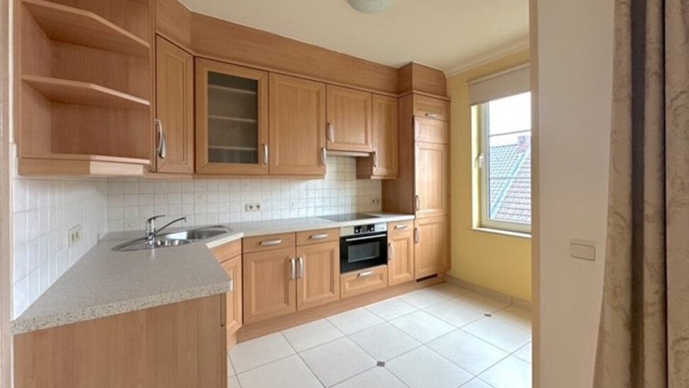 Keuken: 9,6m² op tegelvloer en voorzien van keukenkasten, inductiefornuis, dampkap, warmelucht-oven, koelkast, vriezer met 3 lades, spoelbak en uitgietbak