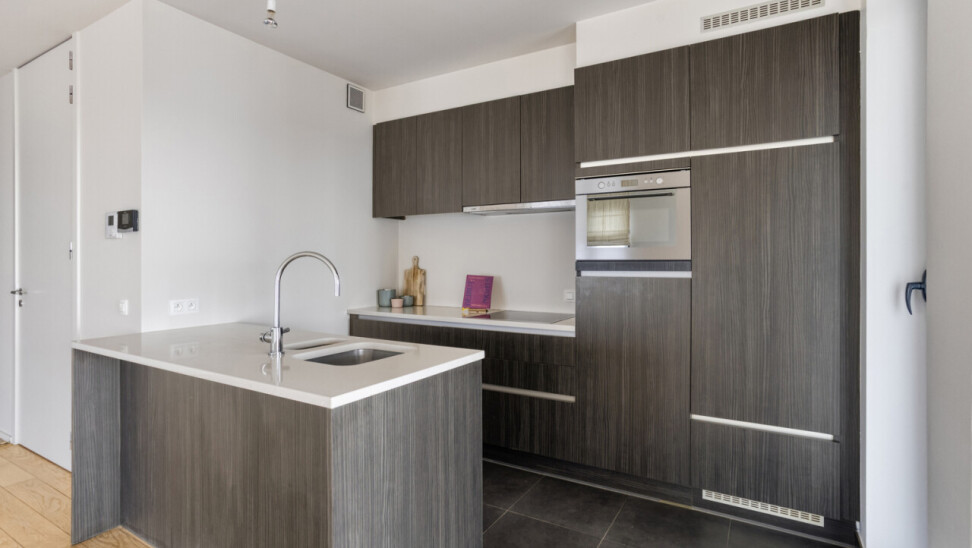 De open keuken is volledig geïntegreerd in de leefruimte.