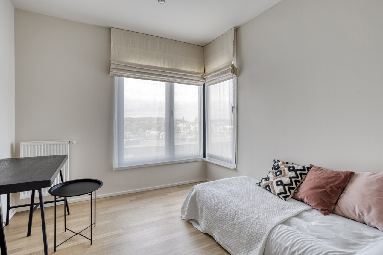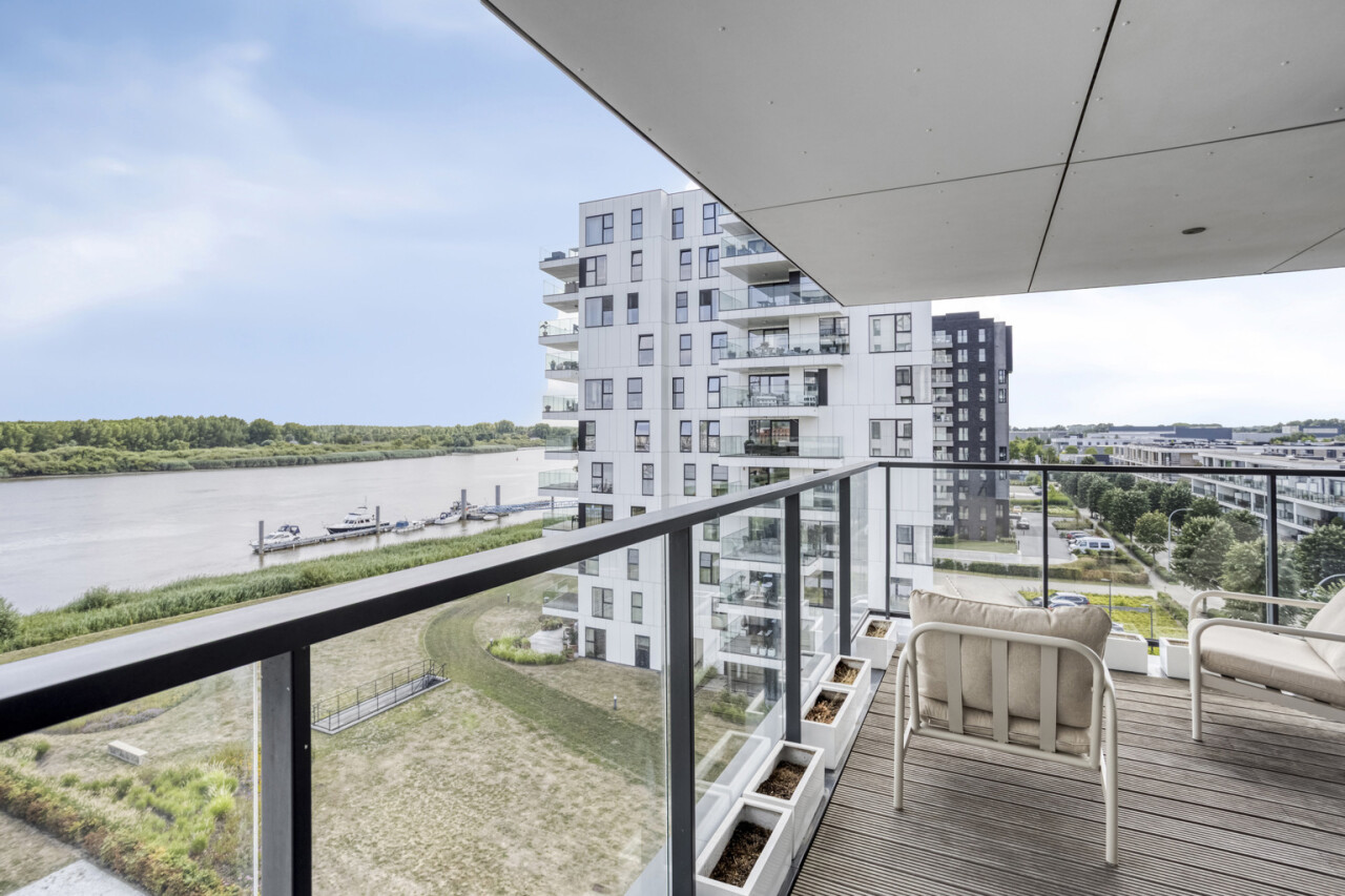 De leefruimte is licht en open, met een hoogwaardige parketvloer en grote raampartijen die zorgen voor een adembenemend zicht op de Schelde.