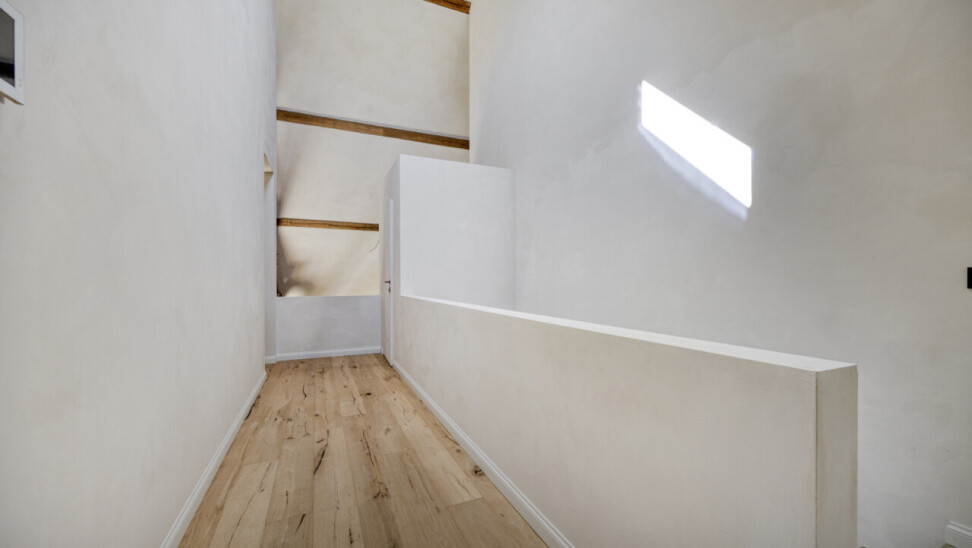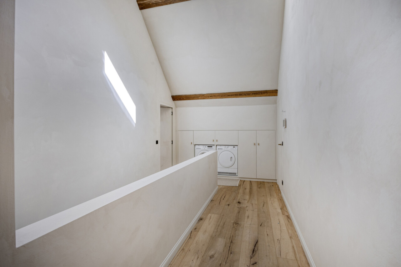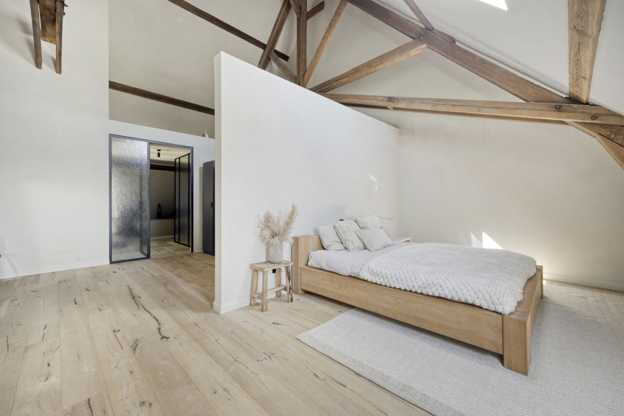 Eén van deze woningen, zijnde "schuur zuid", bevindt zich achteraan op de linkerflank van het project en maakt deel uit van de oorspronkelijke schuur, met behoud van authentieke elementen zoals de imposante zuilen, het karaktervolle dakgebinte en de charmante uilengaten.