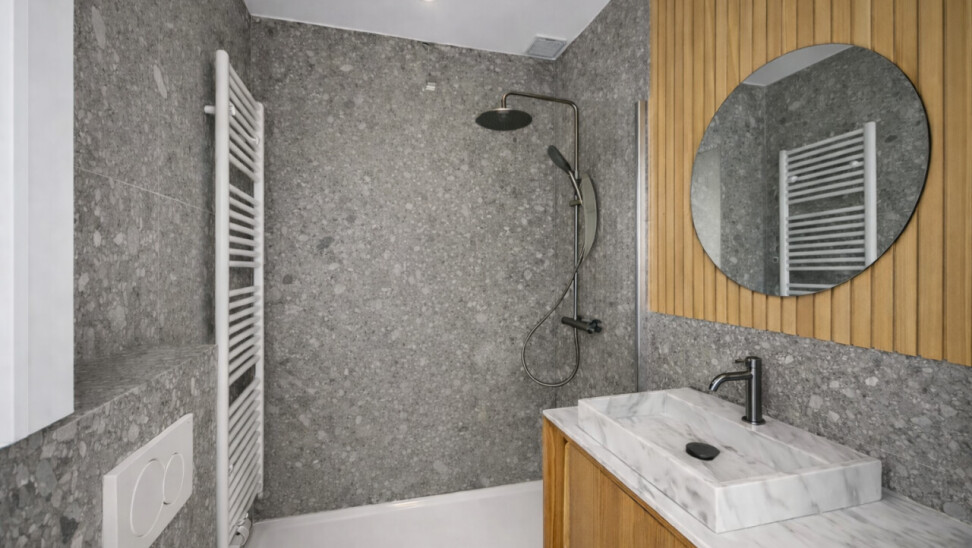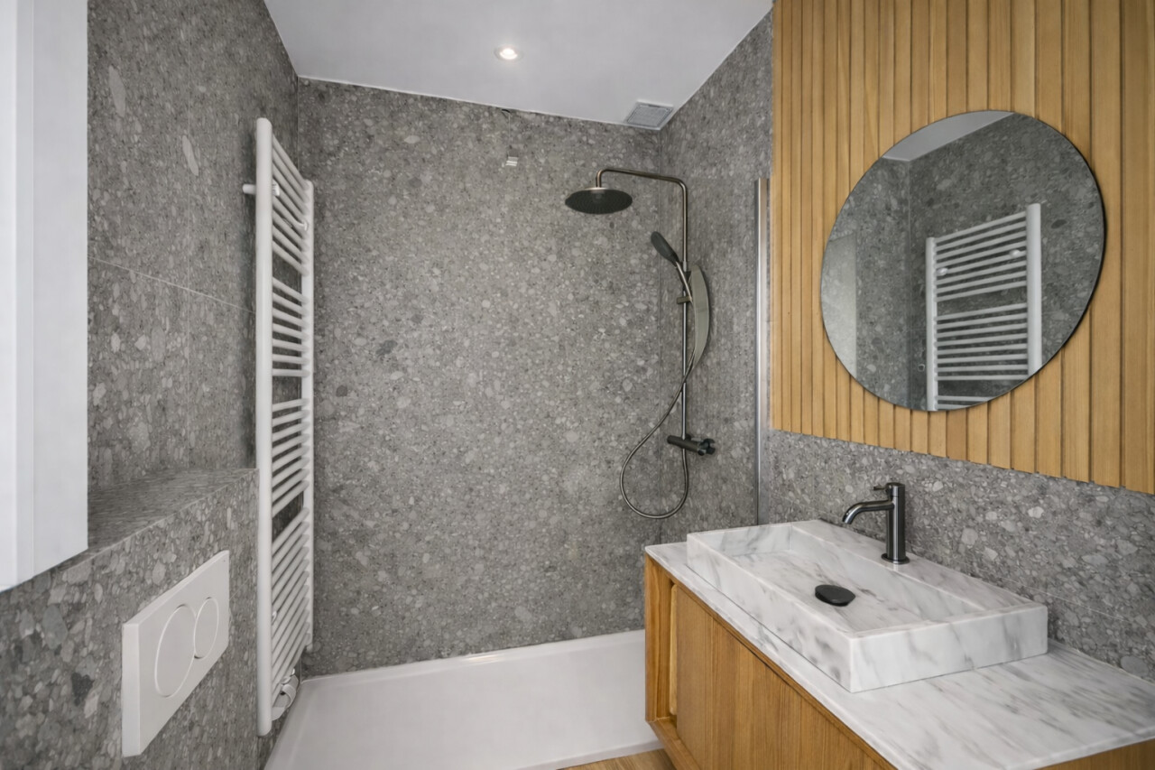 Centraal in het appartement bevindt zich de smaakvol afgewerkte badkamer.