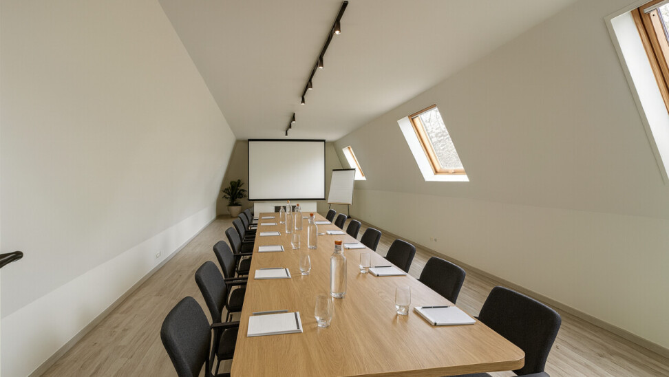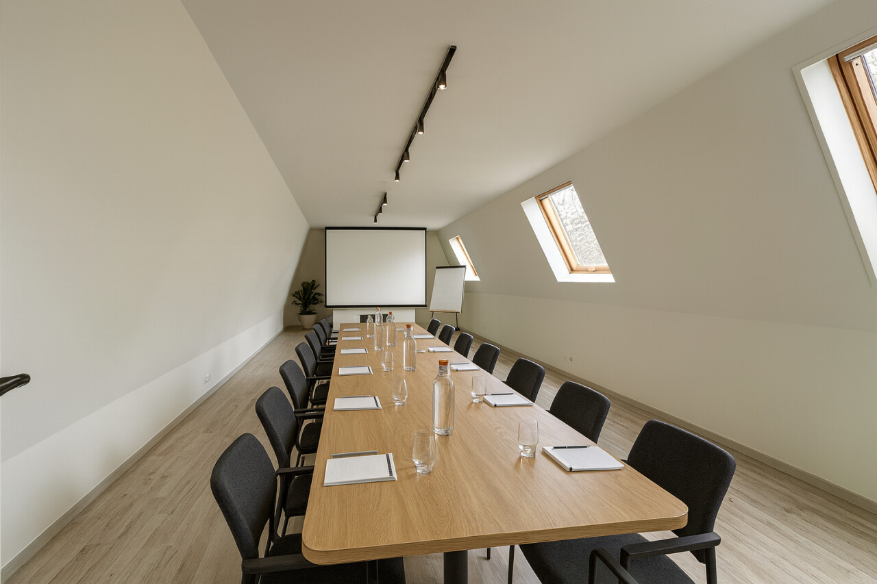 Een volledig uitgeruste vergaderzaal, ideaal voor zakelijke bijeenkomsten, workshops of private events.