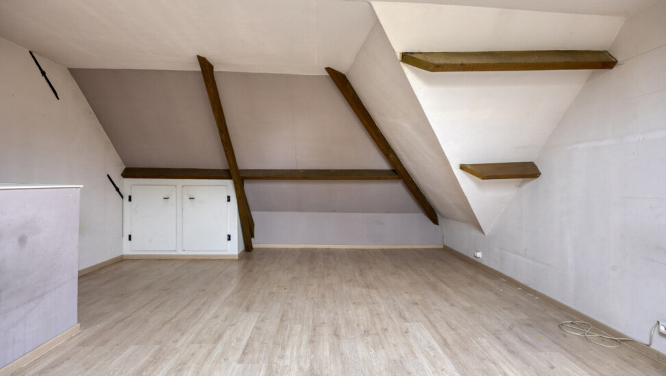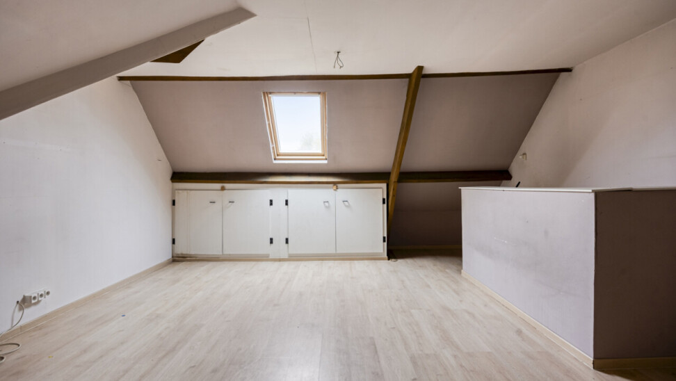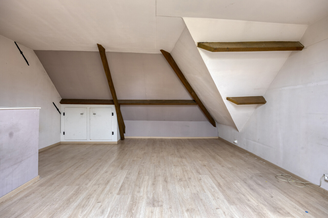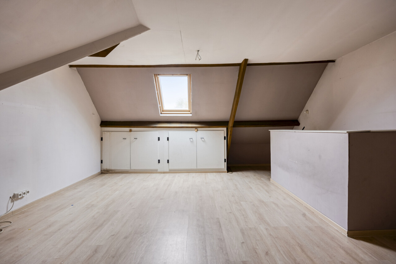 Op de eerste verdieping ontdekken we drie ruime slaapkamers en een badkamer. De zolderverdieping werd omgetoverd tot een vierde, bijzonder ruime slaapkamer — perfect als master bedroom, hobbyruimte of bureau.
