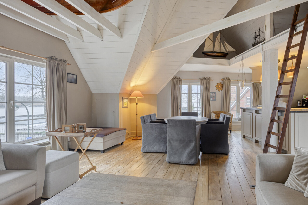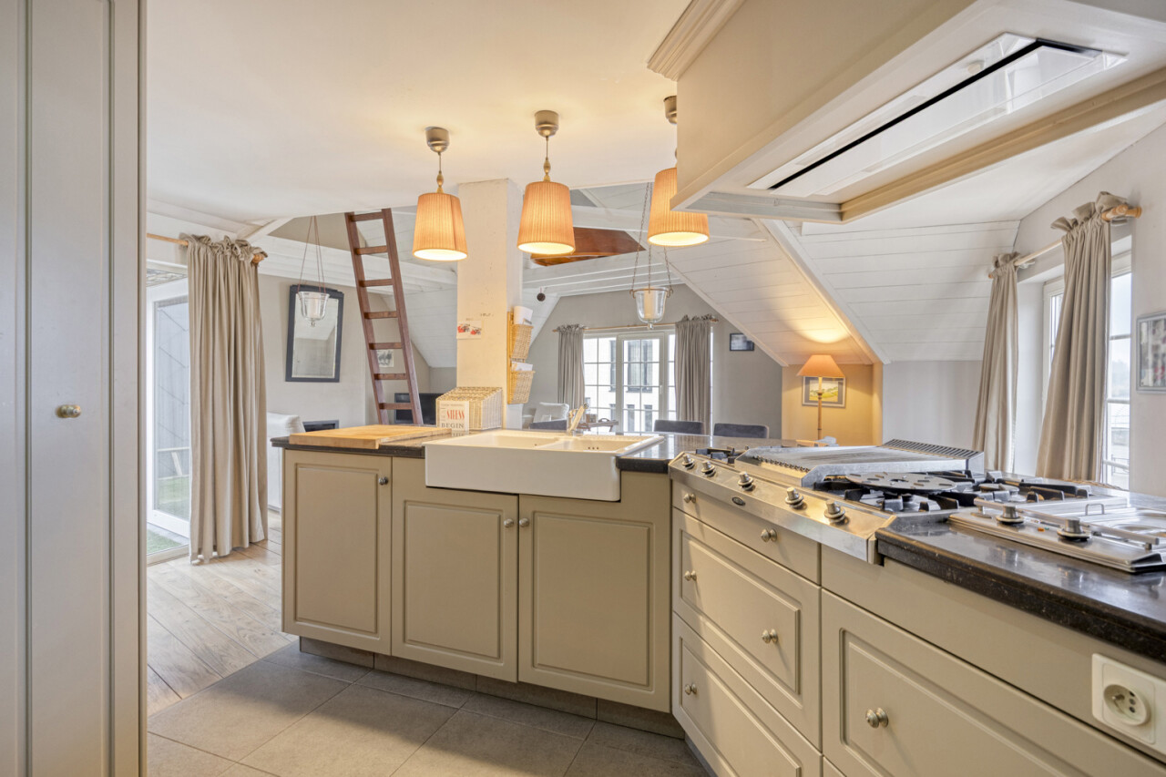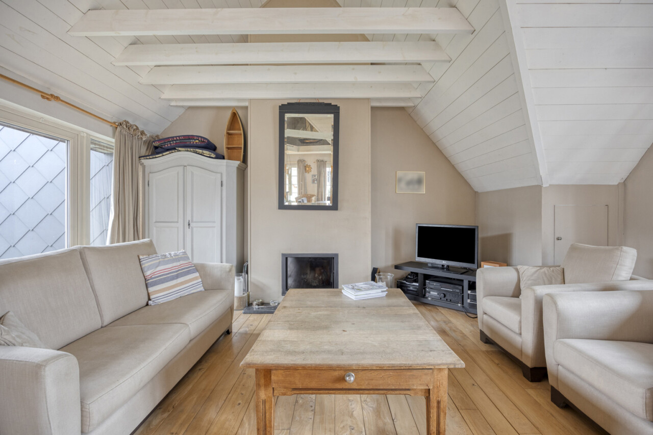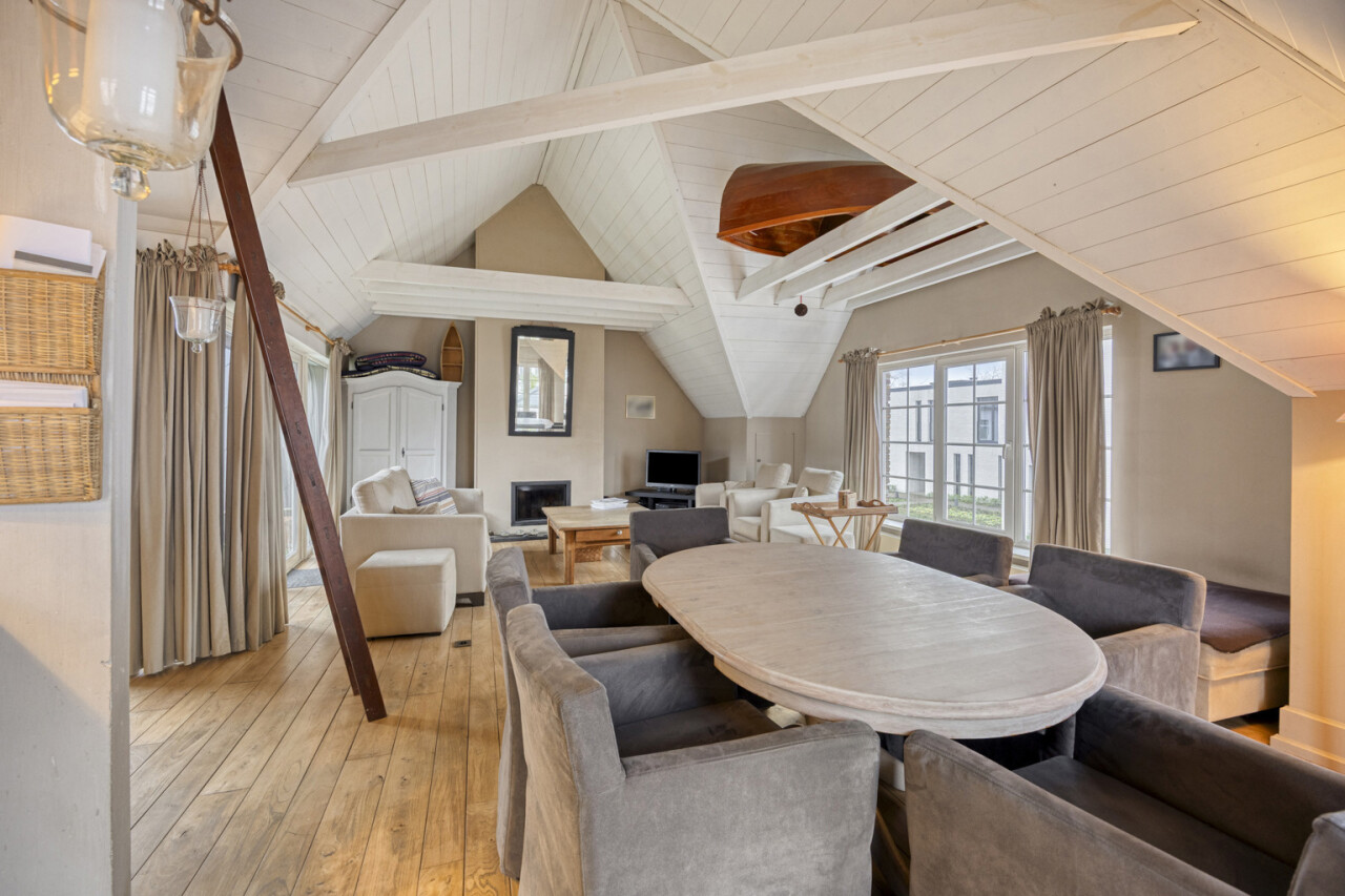 De eerste verdieping vormt het absolute hart van de woning. De lichtrijke leefruimte biedt een open, panoramisch zicht dat een uitgesproken zee- en vakantiegevoel oproept. De geïntegreerde mezzanine is ideaal ingericht als bureau of werkplek, perfect voor thuiswerk in alle rust. De haard zorgt voor extra sfeer en gezelligheid.