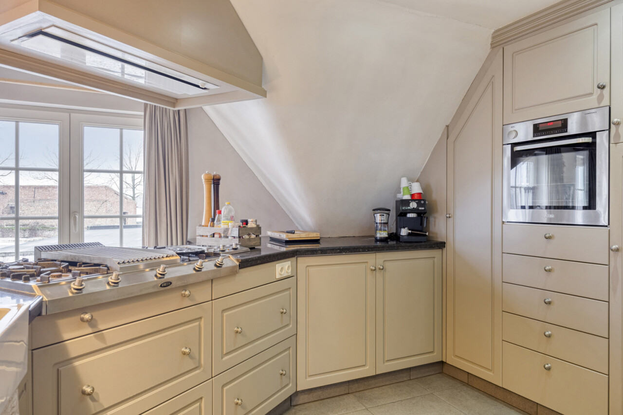 Aansluitend bevindt zich de volledig uitgeruste open keuken, afgewerkt met blauwe hardsteen en voorzien van kwalitatieve toestellen, waaronder: