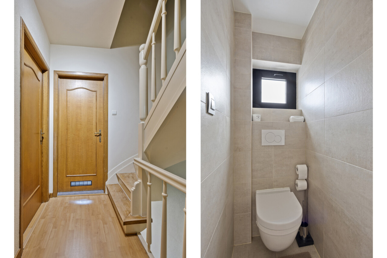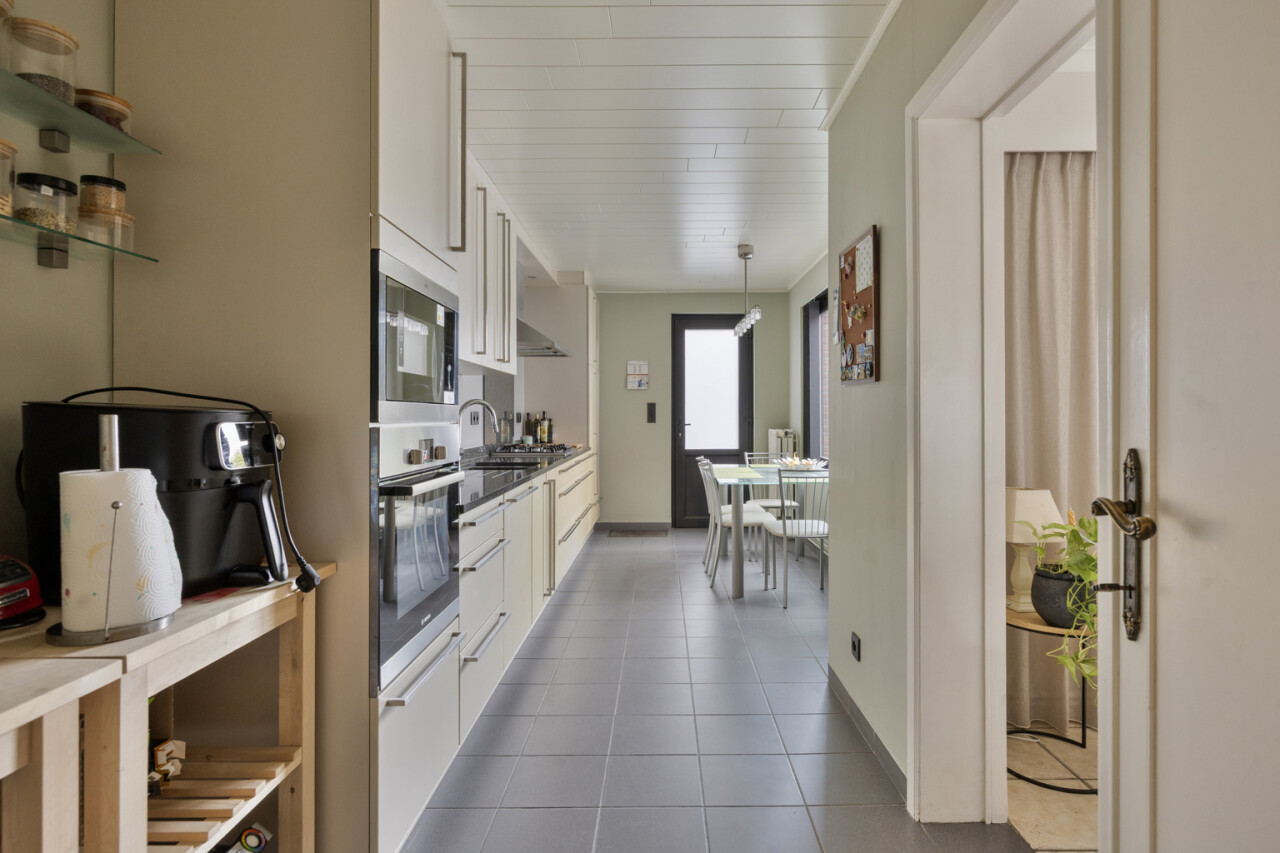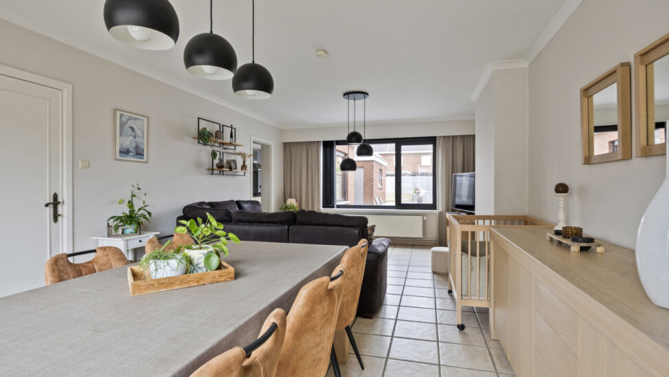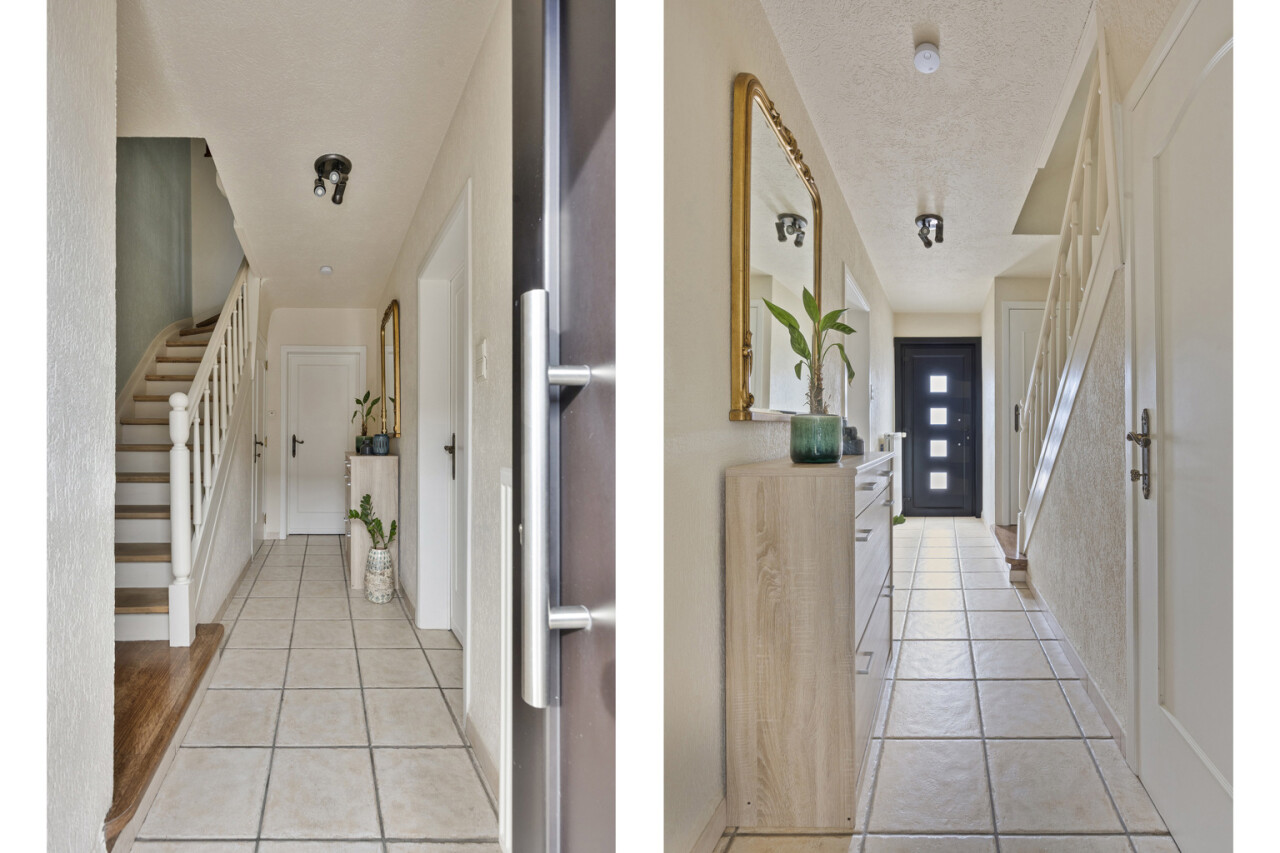 Bij het betreden van de woning kom je binnen via de inkomhal met toegang tot de leefruimte, keuken en gastentoilet. Rechts bevindt zich de zeer ruime en lichtrijke leefruimte, ideaal om te ontspannen of te genieten met familie en vrienden. Aansluitend vind je de ruime keuken met mooi zicht op het terras en de tuin.