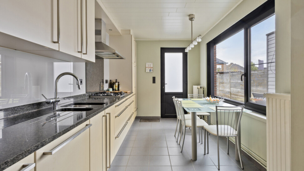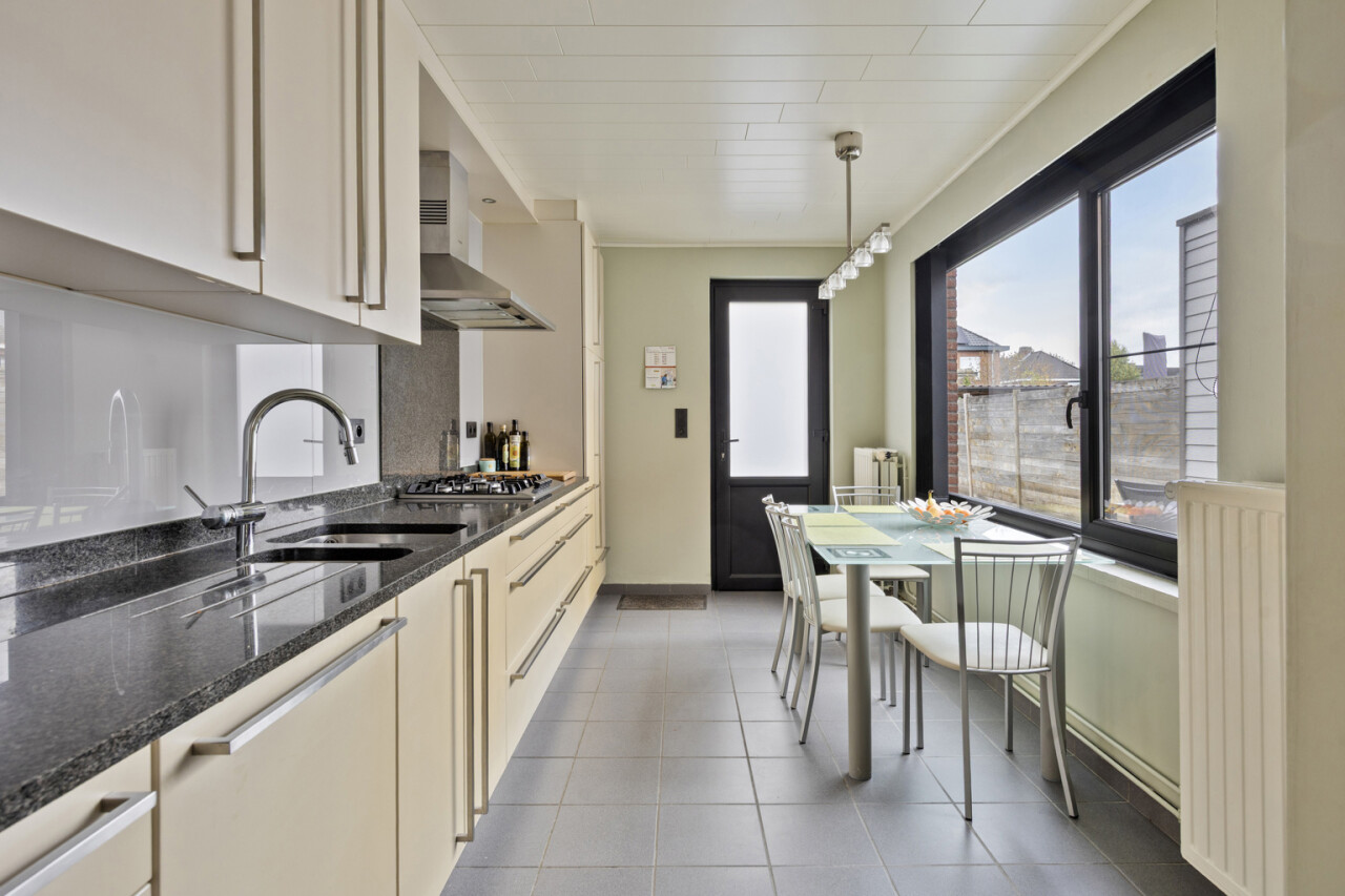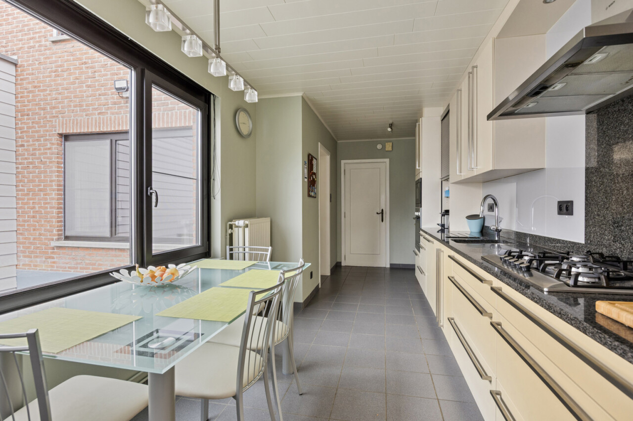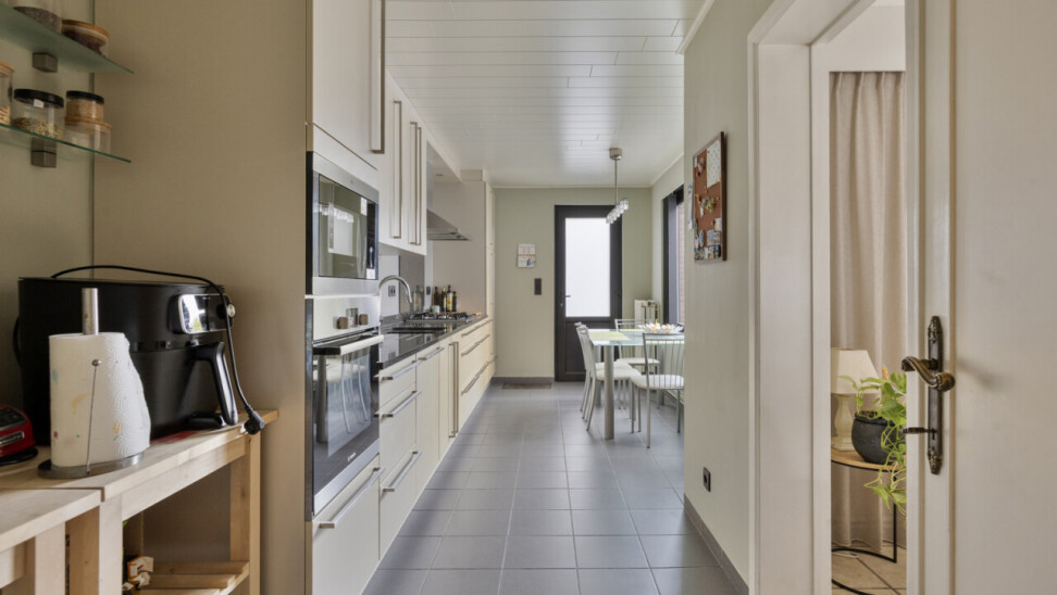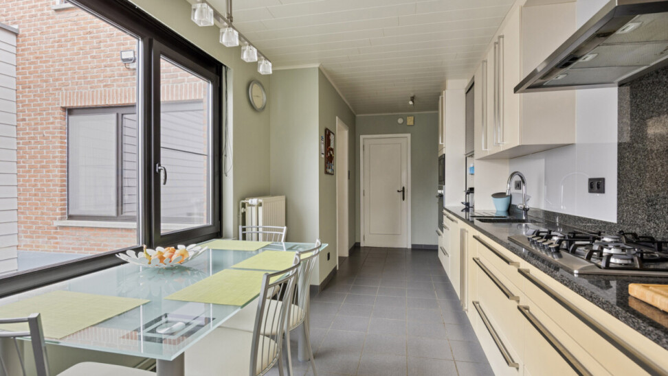 Bij het betreden van de woning kom je binnen via de inkomhal met toegang tot de leefruimte, keuken en gastentoilet. Rechts bevindt zich de zeer ruime en lichtrijke leefruimte, ideaal om te ontspannen of te genieten met familie en vrienden. Aansluitend vind je de ruime keuken met mooi zicht op het terras en de tuin.