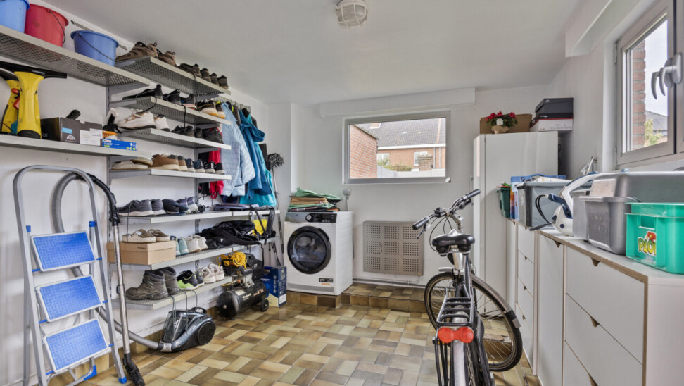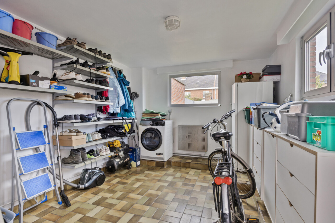 In de tuin bevindt zich een grote berging met verwarming en aansluiting voor wasmachine en droogkast — ideaal als wasruimte of extra hobbyplek.